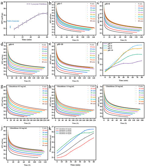 The changes in surface tension of folding Lys are presented in Figure 12. The earlier literature demonstrated that Brownian diffusion is the motive force in early interfacial tension diffusion [29,30]. Over time, the colloidal particles that had been adsorbed at the interface would prevent the particles in the continuous phase from adhering to the particle surface, consequently bringing down the surface tension. In this experiment, the hanging sheet method was used to test the surface tension of the mixed system of Lys and reduced GSH. The surface tension of the solution was 51.7 mN/m with the addition of reduced GSH, which was lower than that of the natural Lys (52.3 mN/m). Compared with the natural Lys, the surface tension of the solution after adding GSH notably declined, which may have been due to the aggregation of partially folded Lys molecules adsorbed to the surface interface [31]. In the process of aggregation, the aggregates on the surface were gradually consumed as reaction time progressed, presumably resulting in the moderate elevation of surface tension until achieving an equilibrium state (56.2 mN/m) (Figure 12a). The impacts of different pH values and reduced GSH concentrations on interfacial tension were investigated. As demonstrated in Figure 12f, as the pH rose, it was in a more alkaline condition such that as the Lys disintegration rate accelerated, the particles in the bulk phase adhered to the interface more rapidly and the interfacial tension of the Lys-reduced GSH mixture had an evident escalating tendency. The surface tension of unfolding lysozyme was enhanced with increasing glutathione concentration, with the other conditions unchanged (Figure 12k).