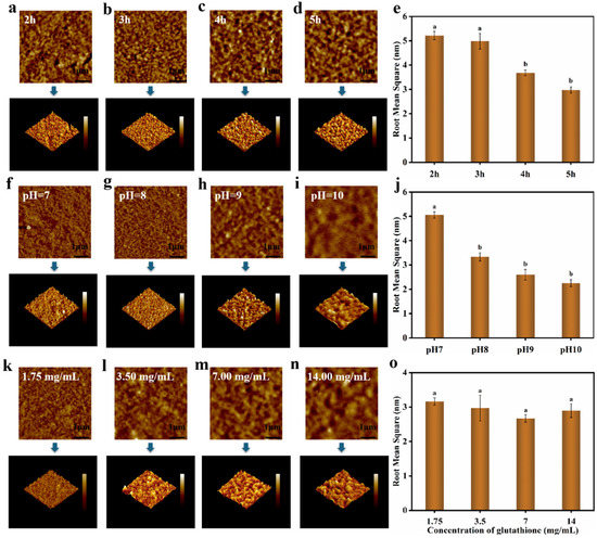 As the growth rate of surface tension slowed down, a complete film tended to form at the interface so as to achieve a new thermodynamic equilibrium [32]. The particles already clinging to the interface were capable of protecting the particles in the continuous phase from sustaining the adsorption to the interface. Lys nanofilms were gathered by the aggregation and accumulation of single-layer particles, for which reason a smooth surface morphology had the potential to be accomplished through the assembly process of rapid nucleation followed by gradual aggregation and fusion [33,34]. The influence of different conditions on the morphology of nanofilms was investigated by AFM. Firstly, we explored the effect of inoculation time on the morphology and roughness of the film, as shown in Figure 13e. The Lys film could be promptly assembled at the interface within 2 h. The morphology of the Lys film was packed more tightly with the passage of time, and its surface became smoother, which might have been conducive to shaping into a protein coating formed by the compact accumulation of oligomers. In parallel, the morphology and roughness of the Lys film were examined in relation to the pH value and GSH concentration, respectively. It can be noted that as the pH of the reaction system rose (Figure 13f–j), the packing became denser as larger oligomers were formed; thus, the roughness of the films decreased in the same period of incubation time. The higher the concentration of reduced GSH (Figure 13k–n), the faster the particles in the bulk phase aggregated over reaction time, together with the fast and tight assembly carried out at the interface [35,36].