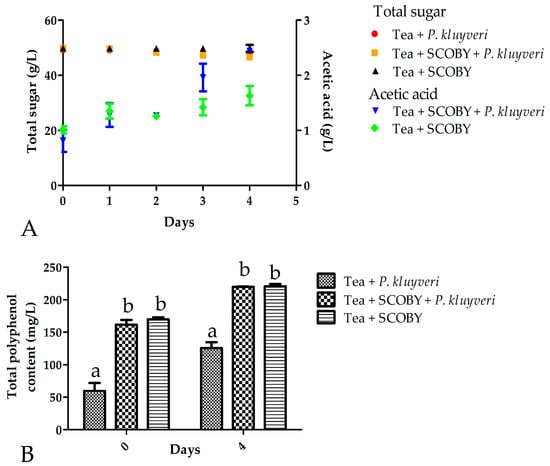 Influence of a Pichia kluyveri starter culture on the total sugar, acetic acid content (A) and total phenolic content (B) of the kombucha fermentation as determined via HPLC and spectrophotometric methods. Values are the average of three replicates. The error bars indicate the standard deviation.