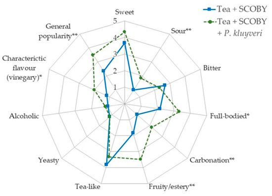 Organoleptic evaluation of the fermented products to assess the influence of the addition of the Pichia kluyveri starter culture. Blue line is the kombucha fermentation without the addition of P. kluyveri and the green dashed line is with the addition of P. kluyveri. The rating scale of the descriptive analysis ranges from 1 (imperceptible) to 5 (very pronounced). The rated general popularity of the taste ranges from 5 (very good) to 1 (bad taste). Significant differences between samples for each attribute were determined via unpaired Student’s t-test and are marked with asterisks (* p < 0.05, ** p < 0.005).