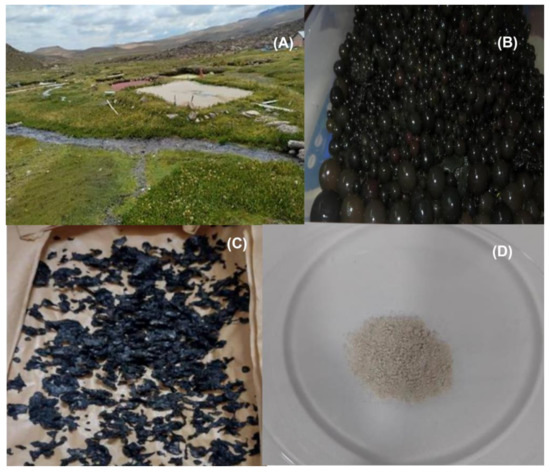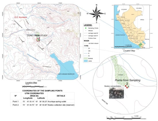 Nostoc algae samples were collected from streams (16°36′19.9″ S, 70°18′1.2″ W) located in the Aruntaya farming community at an altitude of 4434 masl in the Carumas district, Mariscal Nieto Province, Moquegua region (Figure 1).