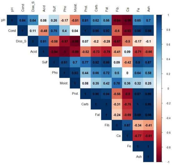 Pearson’s correlation was obtained by associating the characteristics obtained for the water quality of reservoirs and the nutritional properties of cyanobacteria. pH: pH of water, Cond: conductivity, Diss_S: dissolved solids, Acid: acidity, Sulf: sulfates, Pho: phosphates, Moist: moisture, Prot: proteins, Carb: carbohydrates, Fat: fat, Fib.: fiber, Ca: calcium, Fe: iron, and Ash: ash.