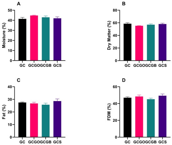 Compositional parameters (means ± standard deviation) of artisanal goat coalho cheeses immersed in cachaça on day 0 of storage. (A) Moisture; (B) Dry matter; (C) Fat; (D) FDM = Fat in dry matter. GC = artisanal unflavored goat coalho cheese; GCGO = artisanal goat coalho cheese immersed in gold cachaça aged in oak barrels; GCGB = artisanal goat coalho cheese immersed in gold cachaça aged in balm barrels; GCS = artisanal goat coalho cheese immersed in silver cachaça.