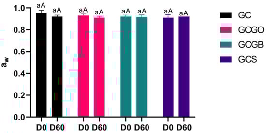 Water activity (means ± standard deviation) of artisanal goat coalho cheeses immersed in cachaça on days 0 and 60 of storage. Different lowercase superscripts indicate significant differences regarding storage times (p < 0.05), and different uppercase superscripts indicate significant differences regarding treatments (p < 0.05); D0 and D60 = days 0 and 60 of storage, respectively.