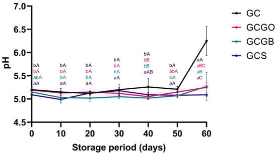 Further, the changes in pH of the artisanal cheeses during the 60-day storage period are shown in Figure 3. In general, cheese pH remained constant, with similar (p > 0.05) values for all treatments until the 30th day of storage. However, GC tended to increase, reaching statistical significance on days 40 and 60 (p < 0.05). Indeed, GC tended to present a higher pH than the cachaça-immersed treatments. In fact, the increase in pH after 40 days of storage may have been caused by the breakdown of protein and peptides leading to the accumulation of ammonia and amines, which are alkaline compounds produced by the starter culture during proteolysis [28]. Concerning the cachaça-immersed cheeses, GCGB was the most acidic cheese throughout storage, while GCGO and GCS had intermediate values. Although the current regulation does not set standards for the pH of cachaça [17], this product is considered acidic, with pH values between 3.9 and 5.3, due to the accumulation of organic acids, extraction of acids from wood casks, or oxidation reactions of alcohol and aldehydes [29].