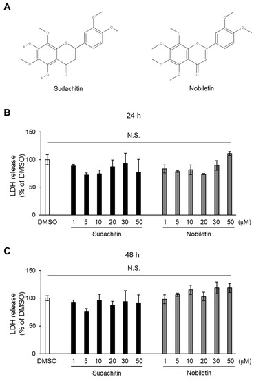 Cytotoxic effects of sudachitin and nobiletin. (A) Structures of sudachitin (5,7,4′-trihydroxy-6,8,3′-trimethoxyflavone) and nobiletin (5,6,7,8,3′,4′-hexamethoxyflavone). (B,C) 3T3-L1 adipocytes are treated with 0.1% DMSO, sudachitin, or nobiletin (1, 5, 10, 20, 30, and 50 µM) for 24 (B) and 48 h (C). Cytotoxicity is assessed using an LDH activity assay. Data are expressed as means ± SEM (n = 3). DMSO: dimethyl sulfoxide; LDH: lactate dehydrogenase; N.S.: not significant; SEM: standard error of the mean.