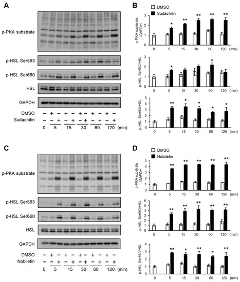 Next, the protein levels of phosphorylated PKA substrates and HSL at Ser563 and Ser660 were measured in 3T3-L1 adipocytes treated with 30 μM sudachitin or nobiletin for 0–120 min (Figure 3A,C). A significant increase in the protein levels of phosphorylated PKA substrates and phosphorylated HSL at Ser563 and Ser660 was detected within 5 min of sudachitin and nobiletin treatment (Figure 3B,D). Protein levels of PKA substrates phosphorylated and HSL phosphorylated at Ser660 were significantly higher in 3T3-L1 adipocytes treated with sudachitin and nobiletin for 5–120 min than those treated with DMSO. Treatment with sudachitin for 60 min resulted in a 1.6-fold increase in the protein levels of HSL phosphorylated at Ser563 when compared to those treated with DMSO (Figure 3B). Treatment with nobiletin for 5–120 min showed a 2.4-to-3.3-fold increase in protein levels of HSL phosphorylated at Ser563 when compared to those treated with DMSO for the corresponding time period (Figure 3D).