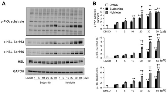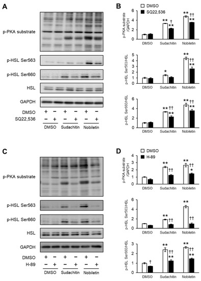 Intake of citrus peel polymethoxyflavones, such as sudachitin and nobiletin, prevents obesity in humans and rodents [25,26,27,40]. Nobiletin is known to promote lipolysis in adipocytes [14]. However, the effect of sudachitin on adipocyte lipolysis remains unclear. Herein, the effects of sudachitin on lipolysis and cAMP/PKA/HSL pathway activation in 3T3-L1 adipocytes are examined. Sudachitin and nobiletin induced glycerol release into the medium and increased the levels of intracellular cAMP, phosphorylated PKA substrates, and phosphorylated HSL. Pharmacological inhibition of AC and PKA prevented lipolysis and phosphorylation of PKA substrates and HSL stimulated by sudachitin and nobiletin. These findings support the notion that both nobiletin- and sudachitin-induced lipolysis are mediated by the activation of the cAMP/PKA/HSL pathway.