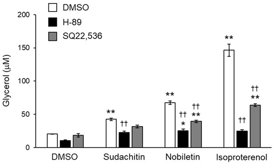 To better define the contribution of cAMP/PKA pathway activation to lipolysis induced by sudachitin and nobiletin, the effects of pharmacological inhibition of AC and PKA on glycerol release from adipocytes treated with sudachitin and nobiletin were investigated. Inhibition of AC and PKA did not affect the amount of glycerol released into the medium by DMSO-treated adipocytes (Figure 5). Glycerol release induced by sudachitin, nobiletin, and isoproterenol was significantly suppressed by pretreatment with the PKA inhibitor H-89 and the AC inhibitor SQ22536.