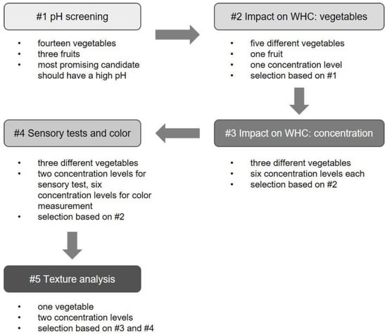 Figure 1 gives an overview over the whole study. At the beginning, the pH values of fourteen vegetables and three fruits were screened (Figure 1 #1). Based on this step, the six vegetables with the highest pH values were selected for further experiments (Figure 1 #2). The three vegetables with the highest impact on WHC were selected for concentration-dependent measurements (Figure 1 #3) and for color assessment and sensory tests (Figure 1 #4). Finally, the most promising vegetable from the preceding experiments #3 and #4 (Figure 1) was subjected to texture analysis.