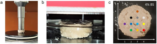 (a) Sample in a Discovery HR-3 Rheometer prior to the compression test; (b) sample in testing device before indentation; (c) distribution of the investigated indents, each marked as a colored dot; x- and y-axes in mm.