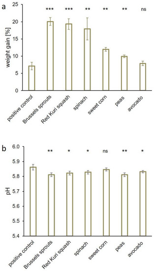(a) WHC of sausage meat samples containing 4% (w/w) freeze-dried Brussels sprouts, Red Kuri squash, spinach, sweet corn, peas, or avocado. The positive control contained a commercial phosphate food additive at a concentration of 0.6% (w/w). The WHC is expressed as the weight gain in percent. (b) The corresponding pH values of the samples are displayed (mean ± standard deviation). Statistically significant differences in the weight gain or the pH value, respectively, between the positive control and the samples were evaluated. The levels of significance were * p ≤ 0.05; ** p ≤ 0.01; *** p ≤ 0.001; and not significant (ns) p > 0.05.