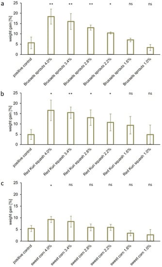 WHC of sausage meat samples containing 4–1% (w/w) freeze-dried (a) Brussels sprouts, (b) Red Kuri squash, or (c) sweet corn. The positive control contained 0.6% (w/w) commercial phosphates. The WHC is expressed as the weight gain in percent (mean ± standard deviation). Statistically significant differences between the positive control and the samples were evaluated. The levels of significance were * p ≤ 0.05; ** p ≤ 0.01; and not significant (ns) p > 0.05.