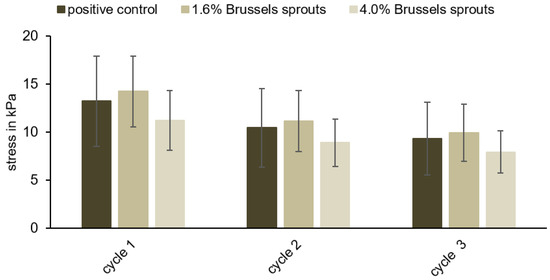 An average stress of 11.22 ± 3.11 kPa (4.0% (w/w) Brussels sprouts) and 14.23 ± 3.67 kPa (1.6% (w/w) Brussel sprouts) was necessary during the first cycle to compress the samples to 50%, compared to 13.24 ± 4.69 kPa for the positive control (Figure 5). Two more compression cycles were measured to identify possible differences between the samples and the positive controls (Figure 5; Supplementary Materials, Figure S2), but the compression behaviors of the sausage meat samples containing 4.0 or 1.6% (w/w) Brussels sprouts and the positive control were very similar. No significant differences were observed in terms of the stress required to compress the samples (p > 0.05).