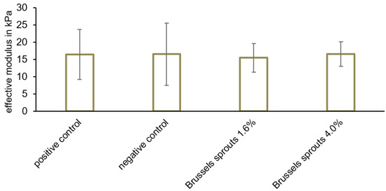Effective modulus of the samples containing 0.6% (w/w) commercial phosphates (positive control), or 1.6 or 4% (w/w) Brussels sprouts, respectively (mean ± standard deviation). The effective modulus did not differ significantly (p > 0.05).