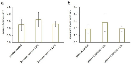 (a) Average shear forces and (b) maximum shear forces of the samples containing 0.6% (w/w) commercial phosphates (positive control) or 1.6 or 4% (w/w) Brussels sprouts, respectively (mean ± standard deviation). The shear forces did not differ significantly (p > 0.05).