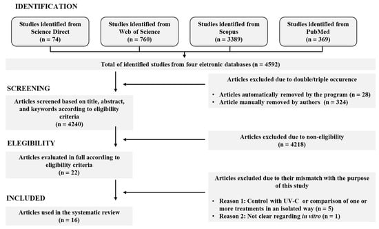 A total of 4592 studies were identified in the following online databases: Scopus (3389; 73.80%), Web of Science (760; 16.55%), PubMed (369; 8.04%), and Science Direct (74; 1.61%). Some studies (352) were deleted due to replicate conditions, and others (4218) were excluded from our inclusion criteria considering titles, abstracts, and keyword reading, leaving a total of 22 articles. These studies were fully read, and six of them were not within the eligibility criteria, resulting in 16 articles for this review (Figure 1).