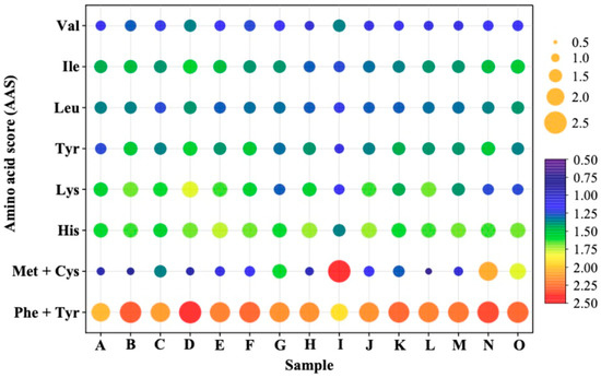 The amino acid score (AAS) is used to determine the effectiveness of absorbed dietary nitrogen in meeting the indispensable amino acid requirement at a safe level of protein intake [35]. According to the report of the WHO/FAO/UHU, the AAS is calculated by dividing mg of amino acid in 1 g test protein with mg of amino acid in a requirement pattern [35]. In the present study, the AAS of indispensable amino acid (expect for Try) was calculated. As shown in Figure 1, the AAS of indispensable amino acids (except for Met + Cys) in PBMA were all higher than 1.0, indicating that they can meet the indispensable amino acid requirement for adults at a safe level of protein intake. However, the sulfur amino acids Met and Cys were found to be the limiting amino acids in some PBMA, which was verified by previous reports [32,33]. In some samples, the AAS of Met + Cys was over 1; this was probably a result of the complementary effect of other ingredients. The first limiting amino acids in soybean protein indicated soybean protein to be a ‘good’ protein source instead of an ‘excellent’ source [32,33]. Due to the presence of limiting amino acids, it is still necessary to ingest multiple proteins or increase the intake of plant-based protein to meet the amino acid requirements, even though the protein contents in PBMA were comparable to those of traditional meat products.