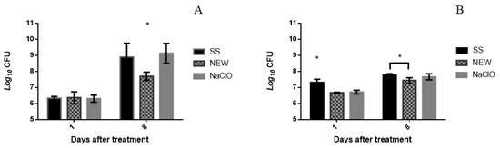Survival numbers of Escherichia coli (A) and Salmonella Typhimurium (B) in contaminated chicken breast after days 1 and 8 of aspersion treatments. * Value with superscript is significantly different at p < 0.05.