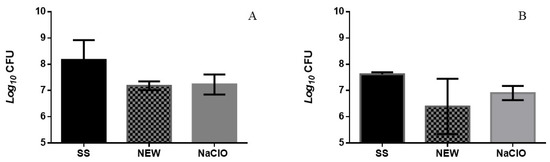 Chemical properties of NEW, NaClO, and SS solutions are listed in Table 1. pH and ORP for NEW are within the expected intervals (pH 6.4–7.5 and 800–900 mV) [24]. The value of total chlorine was known, and in concentrations of 56–60 ppm of residual chlorine, a good antimicrobial effect has been obtained. These conditions provide greater stability and microbicidal effectiveness, and it is also known that residual chlorine concentrations of 56–60 ppm in electrolyzed water provide a good antimicrobial effect [52], whilst NEW had a slightly lower value than expected. NaClO solution showed a concentration that was subsequently adjusted without affecting its bactericidal activity. As we expected, saline solution showed a low ORP, and the chlorine concentration was below our detection methods, which we consider as a chlorine absence. Our results were similar to previous reports [29,53] where NEW properties were evaluated and reported, where the ORP was 1030 mV and had a pH of 6.7. The pH of NEW (used in this study) was similar, although the ORP was lower. The ORP of chlorine was similar to the reported values by Hernández-Pimentel and Guerra [29,53].