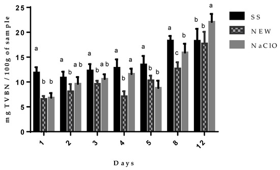 Chicken meat that was treated with NEW had significantly lower values of TVBN over the aforementioned time period. This effect was reported previously when slightly electrolyzed and slightly acid water were used [56] as well as NEW in immersed chicken breast [29]. TVBN limit content values in chicken meat have not been defined, but Tokur [70] reported 18 to 30 mg/100 mg in different types of fish; based on this report, chicken meat treated with NEW or SS kept values of 17.74 and 18.24 mg N/100 g, respectively, at day 12 after treatment, and chicken treated with NaClO, meanwhile, showed a 28.08 mg N/100 g at day 12. There is a relation between the TVBN data and the lactic acid content. Data showed that NEW helped to keep the TVBN values lower in treated chicken breasts, and there is an increment in the pH of chicken meat and a decrease in LA content; if chicken proteolysis exists by enzymes and bacteria, this will generate nitrogen compounds, pH will rise, and lactic acid will decrease, as happens when chicken breasts are treated with saline solution.