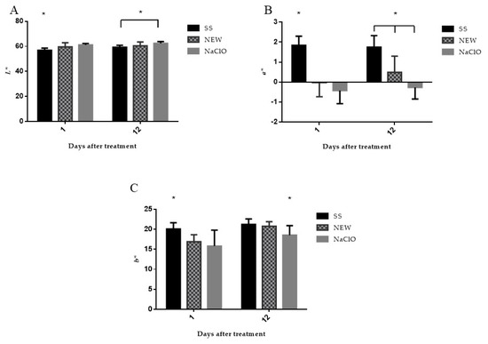 Luminosity depends substantially on the amount of free water that the meat has, and it is associated with the speed and magnitude of the pH change in the meat during the first 20 h postmortem. In general, the quality of the paler or brighter chicken was worse, which might indicate the presence of defects in the meat that are known as Pale Soft and Exudative (PSE) meat;. However, dark chicken can indicate defects known as Dry Firm and Dark (DFD), and in this type of meat, the pH does not decrease during maturation and, therefore, the meat becomes more susceptible to contaminating bacteria, causing a bad aroma that develops during the refrigeration period, not to mention a shorter shelf life [9,75]. Luminosity was slightly increased in the groups of chicken meat treated with NEW and NaClO (Figure 4A) at day 1, and the NEW group showed no change at day 12, but the group treated with NaClO showed a significant increase in its value at day 12 with respect to the SS group. The variation of these values may also be due to the type and age of the bird [54]. The increase of luminosity at day 1 with the chlorine treatment was similar to previous reports [76,77]. However, in another study, where chlorine concentration was higher (200 ppm), the luminosity did not experience a significant change [78].