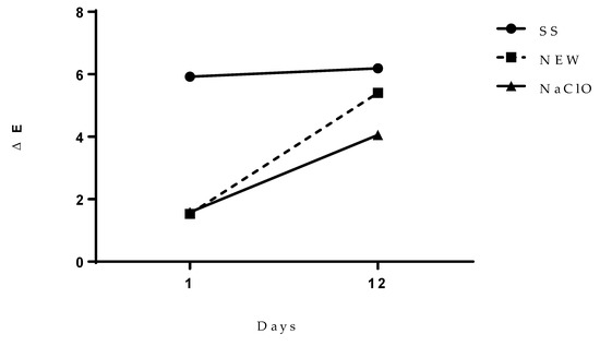 To estimate the entire impact of the involved factors, ΔE value was calculated (Figure 5), where it was observed that both the NEW and the NaClO treatments do not change color at day 1 after treatment. This value showed that chicken color did not change after the treatment, although these values increased at day 12, when the greatest color change was detected by the group treated with SS, which was after the NEW group, and the group with only a minor change was the NaClO one. Kong et al. [64] compared different treatments during thawing of the chicken, and they concluded that the use of electrolyzed water did not change the color of the samples. However, another study reported that when chicken meat was immersed in NEW for 1.5 h, it did not show a significant ΔE value after 10 days of storage at 4 °C [29].