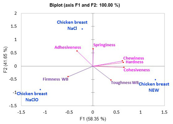 Texture results are shown in Figure 6, where component one explains 58.35% of the sample variability and component two explains 41.65% of it. The samples treated with NEW were characterized by being mainly cohesive and hard (hardness measured with the WBS probes), while the samples treated with SS were adhesive. The chicken treated with NaClO was characterized by being firm (measured with the WBS probe) and presenting attributes of instrumental TPA, such as less intensity, elasticity, chewiness, and hardness. Although more studies are required to evaluate the textural changes found in the chicken breast that had NaClO added, it has been reported that chicken meat with added NaClO during broiler pre-chilling reacts with the meat, producing dichloroacetic acid (DCAA) and tricholoacetic acid (TCAA)—reactions that are precursors found in chicken and water (carbohydrates, lipids, proteins, etc.) [80], which are macronutrients responsible for the texture of the meat. These types of reactions could contribute to changes in texture.