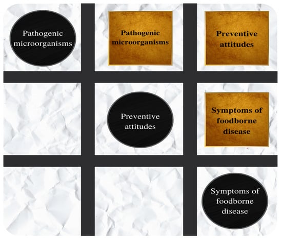 To train about ways to prevent foodborne diseases, a learning game was designed to simulate the tic-tac-toe game. The board game is shown in Figure 1. Square and circle signs showing information about pathogenic microorganisms involved in foodborne diseases, their symptoms, and measures to prevent them were used. These signs showed the main symptoms of each foodborne disease and measures to prevent contamination or reduce the etiological agents to safe levels. The foodborne disease etiological agents addressed were Listeria monocytogenes, Salmonella spp., Staphylococcus aureus, Escherichia coli, Bacillus cereus, and Clostridium perfringens. The participant who completed the triad of information regarding each etiological agent, the symptoms of the disease caused by each etiological agent, and the measures to prevent it was the winner.