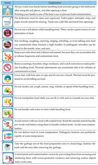 To train about safe food handling for family farmers, a poster using emojis to convey the main concepts of the GMP of foods was developed (Figure 2). Different emojis were used to learn each subject covered in the training. The concepts discussed in the game were correct handwashing, use of personal protective equipment, ways to avoid cross-contamination, hygiene habits of food handlers, pest control, and safe food storage. The participants were asked to choose an image each time and listen to an explanation about it.