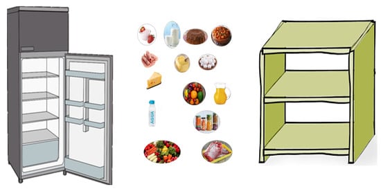 To train about safe food storage, a banner with a refrigerator image and a food cupboard image was developed. Several signs with different food images were printed. These different types of foods needed to be placed in the correct storage place, i.e., the refrigerator or the food cupboard. There were foodstuffs that needed to be placed in cold or frozen storage (these foods needed to be placed in the lower or upper part of the refrigerator, respectively) or stored at room temperature (these foods needed to be placed in the food cupboard). Topics about cleaning material that must be stored far away from foods and care with ready-to-eat foods, such as time and temperature control for safety, were also mentioned during the training application (Figure 3).