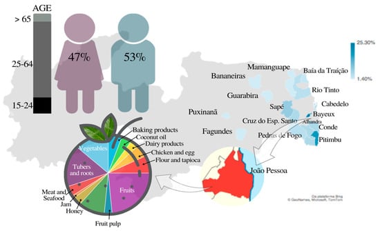 The sociodemographic profile of the family farmers and the diversity of products commercialized by them in public food markets are shown in Figure 4. The ages and genders of 75 family farmer groups (572 people) and a map where places with blue color represent the cities of origin of the family farmers are presented. The darker the blue, the greater the concentration of the family farmers who came from that city to work at the nine public food markets located in the city of João Pessoa (red color).