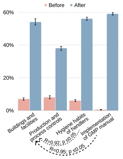 Bar graphs with significant correlations between the variables of the results of GMP assessment, namely, buildings and facilities, production and process controls, hygiene habits of handlers, and implementation of the GMP manual.