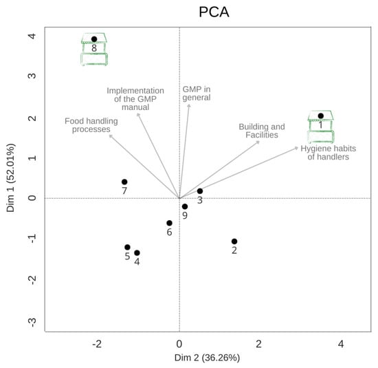 PCA plot ordainment graph of public food markets analyzed with parameters of good manufacturing practices, namely, buildings and facilities, production and process controls, hygiene habits of handlers, and implementation of the GMP manual.