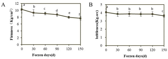 Firmness is one of the important factors to evaluate apple quality [37]. As shown in Figure 1A, the firmness of apple fruit showed a decreasing trend with the increase of frozen days. The decrease of firmness of refrigerated fruit mainly occurred in the first 4 months of storage period, and the decrease was larger. The firmness of fruit decreased from 10.25 kg/cm2 to 7.67 kg/cm2 at 150 days of cold storage, which was 25.17% lower than that of harvest period. As shown in Figure 1B, the fruit brittleness showed a slow downward trend with the prolongation of storage time, indicating that refrigeration was beneficial to the fruit. It shows that cold storage can maintain fruit firmness quality attributes well.