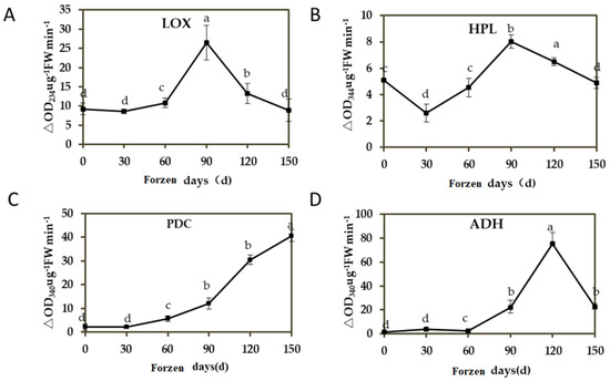Changes of aroma synthase during apple cold storage. (A) Lipoxygenase (LOX); (B) Hydroperoxide lyase (HPL); (C) Keto acid decarboxylase (PDC); (D) Acetaldehyde dehydrogenase (ADH). Error bars show ± SE from three biological replicates. Different lowercase letters in columns denote significant differences between sampling dates for ‘RuiXue’ fruit by Duncan’s multiple range test (p < 0.05).