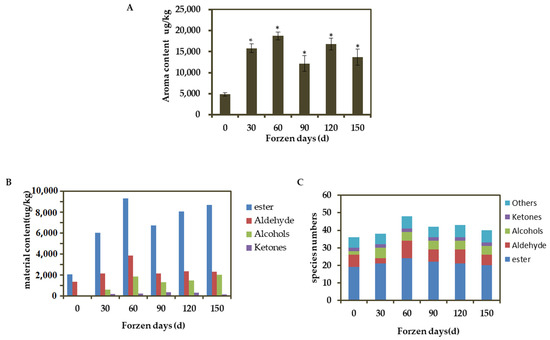 VOC in apple fruits during different cold storage periods. (A) Total volatile content, * indicates that the difference is statistically significant at the p < 0.05 level. Error bars were calculated from three biological experiments, and show the standard deviation of the mean; (B) The content of VOC in each component; (C) Number of VOC. Different colors represent different types of volatile substances.