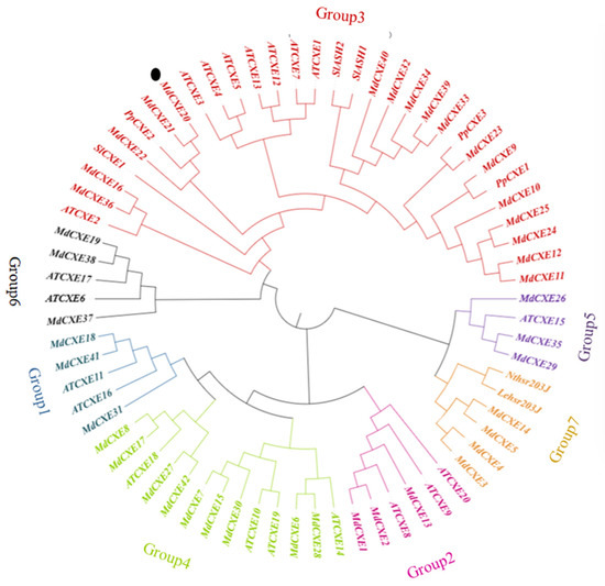 According to the location of the selected genes on the chromosome, we systematically named them as MdCXE1-MdCXE42 (Table S3). We performed phylogenetic analysis on the predicted 42 apple CXE genes, 4 tomato CXE genes with known functions, 3 peach CXE genes and 20 AtCXEs genes previously reported (Figure 4). According to the classification of Arabidopsis [19], 42 members were divided into 7 clades (Group 1–7). In addition, as revealed by Blastp search, MdCXE has close similarities with carboxylesterases in other higher plants, ranging from 50% to 100%.