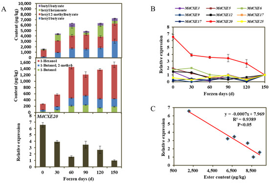 MdCXE gene expression analysis. (A) The content of volatile esters and alcohols and the expression of MdCXE20 gene during apple cold storage. Error bars represent SE (n = 3); (B) Expression pattern of apple CXE gene during cold storage; (C) Transcript levels of CXEs during fruit cold storage which showed significant negative correlation to volatile esters (p < 0.05).