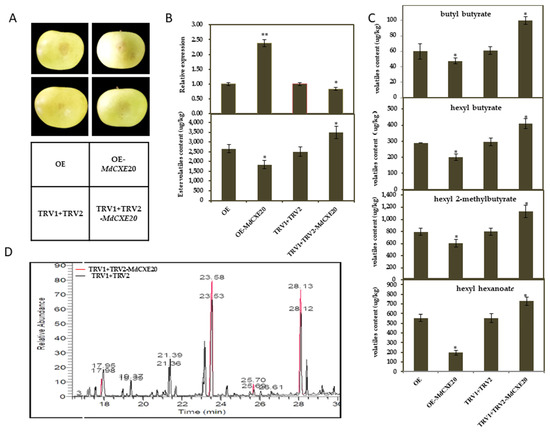 Homologous transient overexpression was used [35] and virus-induced gene silencing (VIGS) system to verify the function of MdCXE20 in volatile substances in apple fruits. In this study, we created pGreen-OE-MdCXE20 and TRV1 + TRV2-MdCXE20 vectors, with pGreen-OE and TRV1 + TRV2 vectors as controls. These vectors were then injected into mature apple fruits for further analysis (Figure 6A). The expression of MdCXE20 gene and the changes of VOC were detected 7 days after injection. As shown in Figure 6B, after overexpression of MdCXE20 gene, the expression level increased significantly by about 2.5 times, the corresponding total volatile substances decreased by 2 times, and the esters decreased by about 1.5 times, while silencing MdCXE20, the gene expression decreased significantly. It decreased by about 0.8 times, and the esters increased by about 1.5 times. The contents of butyl butyrate, hexyl hexanoate, hexyl 2-methylbutyrate and hexyl butyrate in apple fruits of MdCXE20 overexpression decreased significantly, and the opposite results were observed after silencing MdCXE20 (Figure 6C). The above results indicated that MdCXE20 gene was involved in the degradation of esters in apple fruit.