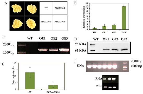 In order to further confirm the function of MdCXE20 on ester volatiles, we performed homologous stable transformation experiments in ‘Wanglin’ callus. Agrobacterium containing pGreen-OE-MdCXE20 construct was used to infect ‘Wanglin’ callus, and wild ‘Wanglin’ callus was used as control (Figure 7A). Three independent lines, MdCXE20-#OE1, MdCXE20-#OE2 and MdCXE20-#OE3, were obtained. Subsequently, the DNA detection and Western Blot detection of the three transgenic lines could detect the target band, while the control could not detect the target band (Figure 7C,D). The gene expression level in the three transgenic lines of overexpression MdCXE20 was significantly higher than that in the wild-type ‘Wanglin’ callus (Figure 7B), the most significant was the MdCXE20-#OE3 line, the transcription level was about 18 times that of the control group, and SPEA-GC-MS analysis was performed. After overexpression of MdCXE20, the content of esters decreased by 78% (Figure 7E). In summary, these results indicate that overexpression of MdCXE20 is involved in the degradation of ester volatiles in plants.