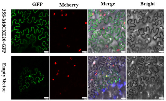 The analysis method is slightly modified based on [36]. The complete CDS sequence of MdCXE20 was fused into the green fluorescent protein GFP to obtain the 35S-GFP-MdCXE20 recombinant plasmid. The primer information is shown in Table 2. According to the method of described in Section 2.6, the fusion protein 35S-GFP-MdCXE20 was transiently overexpressed in a Nicotiana benthamiana plant with MCherry nuclear localization marker by Agrobacterium infection. After 3 days of dark culture after injection, the laser confocal fluorescence microscope was used to observe and photograph.