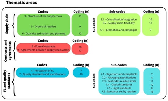 Structure of the coding systems developed and applied in the content analysis to sort the single statements (i.e., codings; n = 177). The codings are divided into three thematic areas: supply chain (n = 63), contracts and agreements (n = 37), and FL and quality standards (n = 77). Every thematic area has different codes, meaning different categories to sort the codings; some categories are also divided into subcategories (subcodes).
