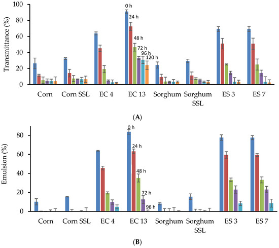Functional properties of native and selected extruded samples. (A) Gel clarity, (B) Emulsion capacity, and (C) Foam capacity. SSL: Sodium Stearoyl Lactylate, EC: Extruded corn, and ES: Extruded sorghum.