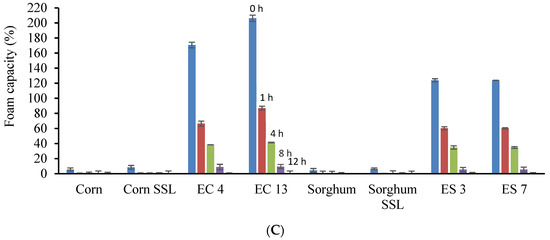 Among the different uses of starches in food formulations, clarity, emulsifying properties, and foaming capacity are commonly considered relevant since these are of industrial importance for various applications [22]. For discussion purposes, only selected treatments (native, native + SSL and two processing conditions will be discussed in this section), the native starches showed a transmittance value of 26.36% for maize and 29.41% for sorghum, which decreased during the storage time (7 days) to reach values ≈5% in both cases. SSL did not significantly affect this parameter; however, maize starch improved to reach 91.1% when extruded at 100 rpm, 40% moisture, and 80 °C. On sorghum, different processing conditions promote an increase in gel clarity, reaching 69.31%, but after storage, the values were similar to non-extruded samples (Figure 2A). Regarding emulsion properties, they are one of the food applications that often require chemical derivatization on starches to achieve the desired results [7,17]. Both native starches showed a weak emulsion capacity, even when SSL was used. Still, it increased significantly (p < 0.05) after extrusion and was further enhanced with SSL (Figure 2B). As in the previous analysis, the foaming capacity improved when SSL and extrusion were combined, reaching values of 83.7% with 100 rpm, 40% moisture, and 80 °C with SSL. Such enhancements may be promoted due to the increase in small Mw components, such as dextrins and small linear glucans generated during the extrusion, that have been shown to enhance complexing with each other and with oil and other molecules, improving the stability of the gel and emulsions, respectively (Figure 2C) [21,23].