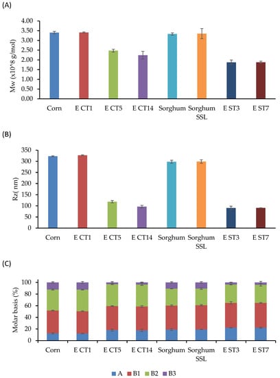 Molecular changes in native and selected extruded starches. (A) Molecular weight, (B) Hydrodynamic radius (Rz), and (C) Chain length distribution.