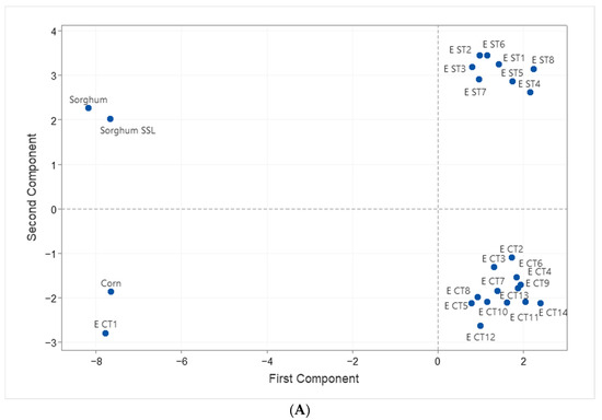 Meaningful correlation analysis of native and extruded starches added with SSL. (A) Score plot, (B) Loading plot. SSL: Sodium Stearoyl Lactylate.