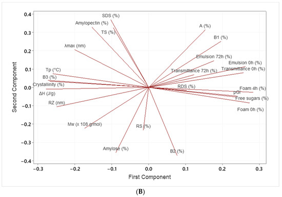 PCA analyses helped understand the extent of molecular interactions within samples, which otherwise would be complicated to explain. We choose the variables related to the starch architecture, in vitro digestibility, and functional properties. The first and second components (PC1 and PC2) accounted for an accumulative variance of 85.4%. The score plot showed significant differences when extrusion with and without SSL was tested, differentiating between starch sources (Figure 4A). The loading plot (Figure 4B) showed the correlations among the evaluated variables. The main contributor factors were the crystalline structure assessed by X-ray diffraction, influenced by amylopectin B3 type chains. The second component was the RS fraction, followed by B2-type chains of amylopectin, which other authors have related to improved emulsion stability [4,6]. That could stabilize the system. These results showed that the cluster arrangement and amylopectin fine architecture of these two starch sources preserve many of the granules’ structural characteristics (as seen in Figure 1) and, at the same time, expose its –OH groups, promoting enhanced interactions when used as emulsifiers or foam promoting ingredients, mainly when SSL was used in the process.