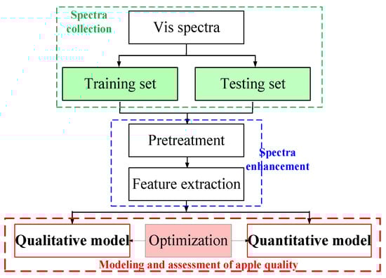 Our main aim is to develop a highly accurate and high performance-to-cost ratio assessment scheme to detect apple quality via Vis spectroscopy; to establish qualitative and quantitative models via ANN; and, finally, to ensure the high classification accuracy and sufficiently low RMSE value of apple SSC values by using spectra enhancement and intelligent optimization methods. In this work, SSC was used to evaluate the quality of apples. SSC normally refers to the percentage concentration of soluble sugars (mainly fructose, glucose, and sucrose) in fruit, and there is a significant positive correlation between SSC and soluble sugars [20]. SSC is an important apple quality element because of its commercial value and intuitive taste. Therefore, SSC is commonly used in production to compare the sugar contents of fruit. In general, apples with a high and uniform SSC (≥13 °Brix) have a sweeter and more delicious taste, which is preferred by consumers [4]. The basic framework of qualitative and quantitative assessments of apple SSC values using Vis spectroscopy is provided in Figure 1.