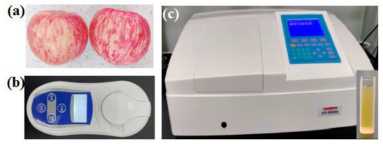 Apple samples (a), the commercial refractive fructose meter (b), and UV-Vis spectrophotometer and cuvette (c).